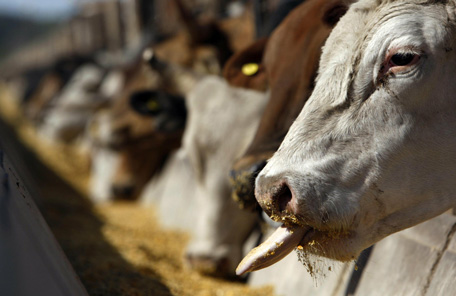 A cow sticks its tongue out while being fed at a feedlot in Santa Lucia, some 200 km (124 miles) northeast of Buenos Aires. (REUTERS)