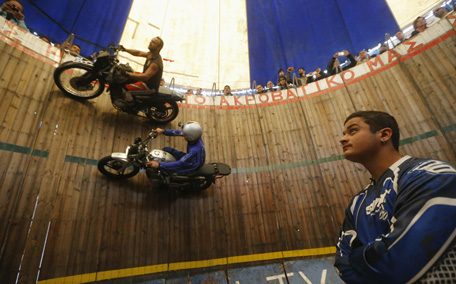 Akis Andreou (top), 38, and fellow stuntman Akis Koutsoudakis perform acrobatics in the "Wall of Death", a barrel-shaped wooden structure in Athens. (REUTERS)