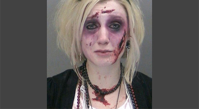 Officials say she got back in her car and was stopped again around 5 am driving on the same road and still in her zombie costume and makeup. Her police mug shot shows were wearing fake blood and cuts on her face.