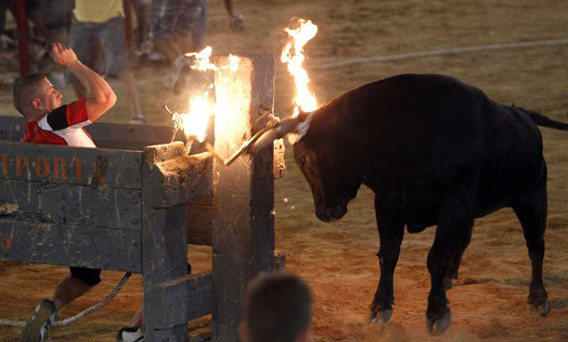 But after Catalonia banned bullfighting, politicians there put in protections for other bull-related traditions, including "correbous" — when metal rods with flaming balls of wax or fireworks are attached to bulls' horns before they are let loose to run around bull rings or plazas and chase people.