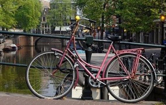 A bicycle is fixed to the railing of a bridge in Amsterdam. Police in a city in the bicycle-crazy Netherlands, fed up with high levels of theft, said they are leaving out two-wheelers secretly equipped with trackers to catch thieves. (AFP)