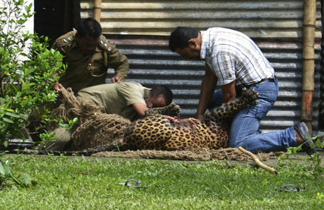 Indian forest officials and a civilian wrestle with a leopard as they catch it in Duliajan near Dibrugarh in Assam state, India. The animal which was found hiding inside a residential area. (AP)