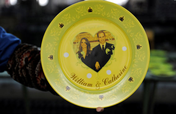 Chinese workers inspect royal wedding chinaware plates featuring images of Britain's Prince William and Kate Middleton, at the Tri-Ring Group Corporation workshop in Yulin, southwest China's Guangxi region on January 10, 2011, where a total of 16,008 pieces of porcelain are due for delivery on January 15 to Britain. The second-in-line to the throne Prince William will marry his university sweetheart Kate Middleton on April 29 in what is likely to be the biggest British royal wedding since his late mother Diana married Prince Charles in 1981. (AFP)
