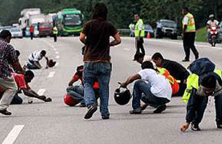 Accident that resulted in about RM75,000 ($31,568) worth of coins being strewn on a highway saw motorists risking their lives as they scrambled to get the money. (AGENCIES)