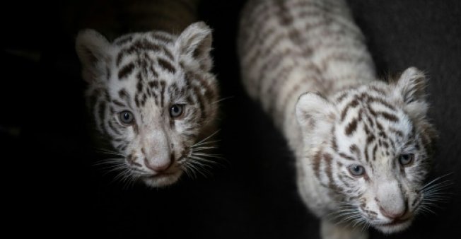The tigers' white fur is a genetic variation of the common orange Bengal tiger.