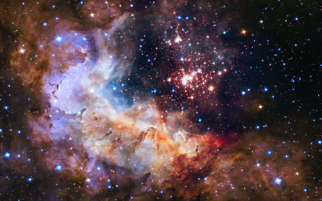 The giant star cluster is about 2 million years old and contains some of our galaxy’s hottest, brightest and most massive stars. Some of its heftiest stars unleash torrents of ultraviolet light and hurricane-force winds of charged particles etching into the enveloping hydrogen gas cloud.