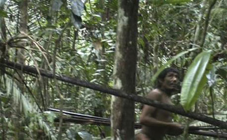 In this frame grab taken from video shot in 2011 by Brazil's National Indian Foundation (FUNAI) and released on Wednesday, Aug. 14, 2013, a Kawahiva Indian carries arrows in the Amazon jungle in Brazil. (AP)