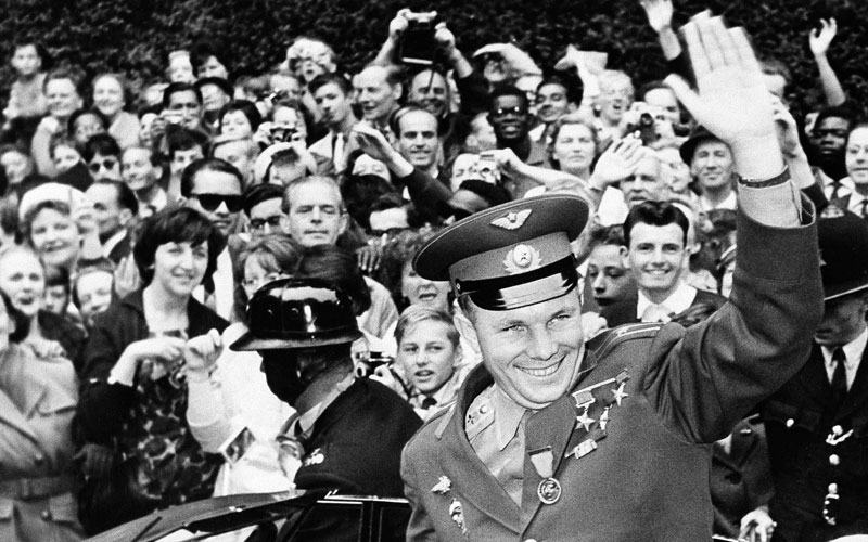In this July 15, 1961 picture, cosmonaut Yuri Gagarin, in an open car outside the Russian embassy in London and waves to the crowd as he departs for home. It was the Soviet Union's own giant leap for mankind _ one that would spur a humiliated America to race for the moon. It happened on Tuesday, April 12, 1961 when the air force pilot became the first human in space. (AP Photo/File)