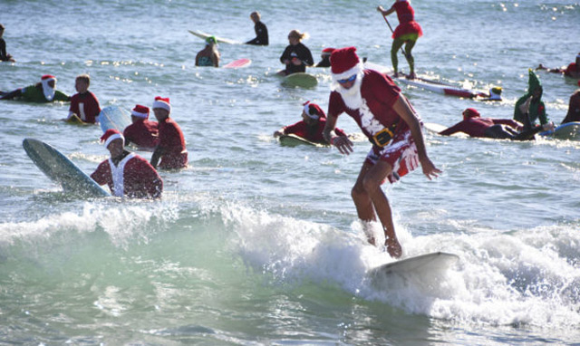 The surfing Santas have been riding the waves off Coach Beach on Christmas Eve for the past decade.