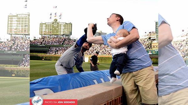 A man holding a baby made a great barehanded catch over the glove of Dodgers first baseman Adrian Gonzalez on Tuesday night, prompting a replay review.