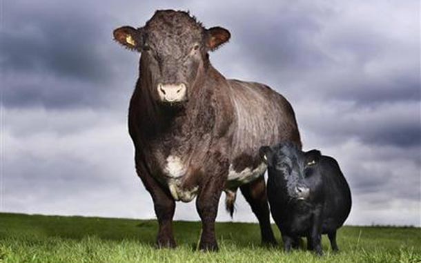 Guinness World Records handout photo made available of Swallow, right, an 11-year-old cow from Yorkshire posing next to Freddie the bull. The minuscule cow with a taste for contemporary music has been named the world's smallest by the Guinness World Records book. Guinness says the sheep-sized bovine from the West Yorkshire region of northern England measures roughly 33 inches (84 centimeters) from hind to foot. At 33 inches she has been named the world's smallest cow. (AP)