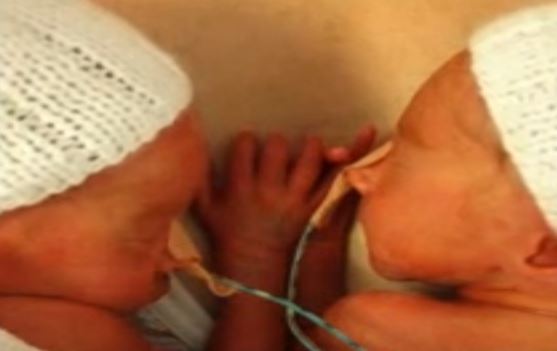 Newborns reached out across the incubator and clasped onto one another. (YouTube)