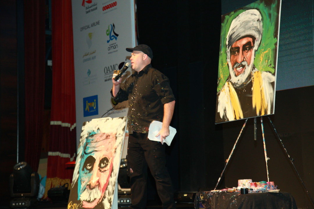 He could virtually take the multinational audience spellbound by setting ablaze the canvas to create a life like image of none other than Sultan bin Qaboos bin Said, the ruler of Oman. The audience were in awe, the Australian painter and entertainer completed the portrait within four minutes after keeping them guessing as to who was to emerge from his messy exercise.