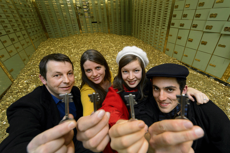 (Left to right) Members of a committee in charge of a campaign for a referendum --Daniel Haeni, Pola Rapatt, Marilola Wili and Che Wagner --hold keys as they pose with eight million coins of Swiss five-cent in a vault on December 3 in Basel, inside a bank safe that will both go on sale on a luxury website. (AFP)