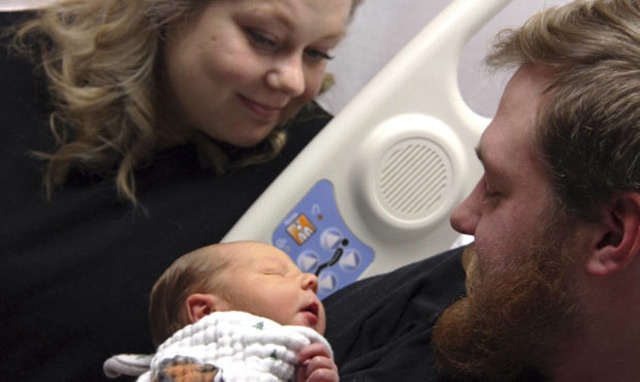 Andrew Goette and his wife, Ashley, look at their baby, Lennon, at United Hospital in Saint Paul. (AP)