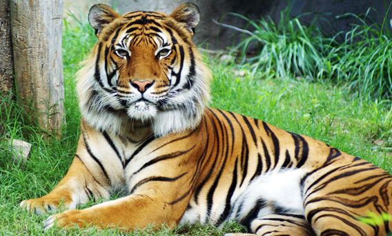 In this July 28, 2011 photo provided by the El Paso Zoo, Wzui, a male Malayan Tiger, reclines at the El Paso Zoo in El Paso, Texas. Wzui was killed by his mate at the zoo on Thursday. Malayan tigers are an endangered species. (AP)