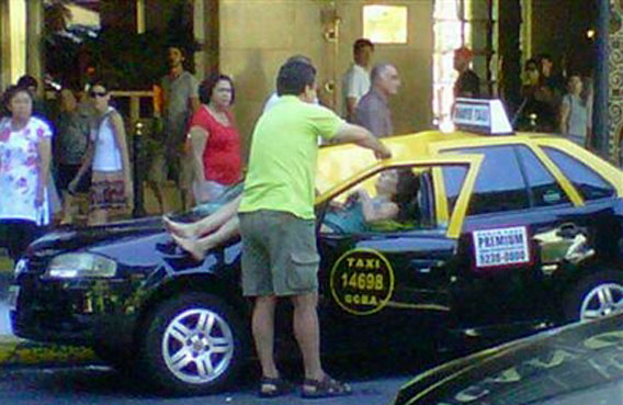 A woman lies injured atop a taxi where she fell from the 23rd floor of the Hotel Panamericano in Buenos Aires. (REUTERS)