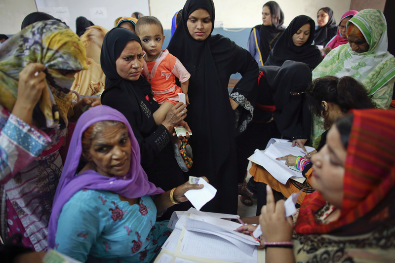 Pakistani women voters wait outside a polling station to cast their votes in Rawalpindi, Pakistan on Saturday, May 11, 2013. Defying the danger of militant attacks, Pakistanis streamed to the polls Saturday for a historic vote pitting a former cricket star against a two-time prime minister and an unpopular incumbent. But attacks that killed several people and wounded dozens more underlined the risks many people took just casting their ballots. (AP)