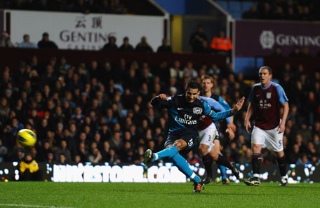 Robin van Persie of Arsenal scores the opening goal from the penalty spot during the Barclays Premier League match against Aston Villa at Villa Park on December 21 in Birmingham, England. (FILE)