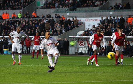 Scott Sinclair of Swansea City scores from the penalty spot during the Barclays Premier League match against Arsenal at Liberty Stadium on Sunday in Swansea, Wales. (GETTY)