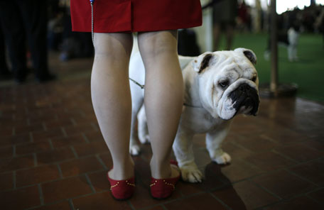 Murphy, a Bulldog from San Francisco, California, stands with his owner and handler Suzie Holleran before judging at the 139th Westminster Kennel Club's Dog Show in the Manhattan borough of New York February 16, 2015. (Reuters)