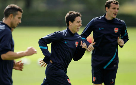 Arsenal's Samir Nasri (centre) takes part in a training session at their training facilities in London Colney, England, on Monday. (AP)