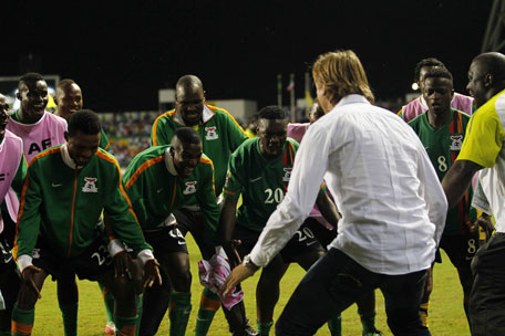 Zambia's head coach Herve Renard dances with his team after their victory against Ivory Coast in the African Nations Cup final at the Stade De L'Amitie Stadium in Libreville on Sunday. (REUTERS)