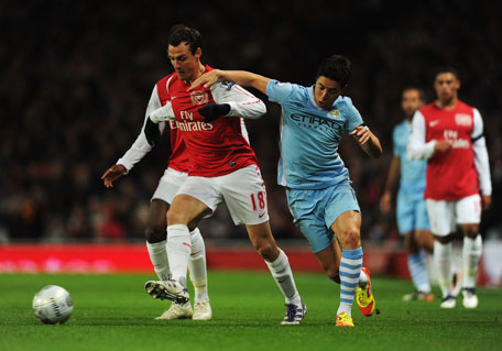 Arsenal's Sebastien Squillaci holds off Samir Nasri of Manchester City during the Carling Cup quarter-final at Emirates Stadium on Tuesday in London, England. (GETTY)
