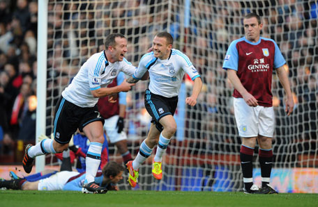 Richard Dunne of Aston Villa looks dejected as Craig Bellamy of Liverpool celebrates scoring with Charlie Adam during the Barclays Premier League match at Villa Park on Sunday in Birmingham, England. (GETTY)