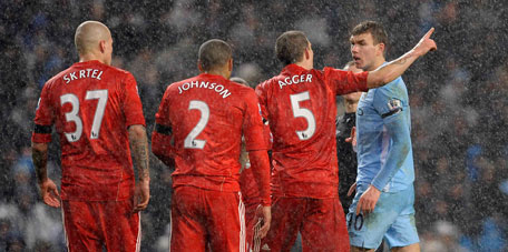 Manchester City's Edin Dzeko (right) argues with Liverpool's Daniel Agger (second right) during their English Premier League match at the Etihad Stadium in Manchester, England on January 3. (FILE)