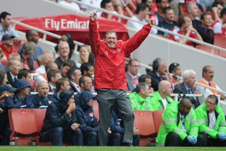 Liverpool manager Kenny Dalglish celebrates victory after the Barclays Premier League match against Arsenal at the Emirates Stadium on Saturday in London, England. (GETTY)