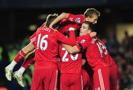 Liverpool players celebrate the goal scored by Maxi Rodriguez during the Carling Cup quarter-final against Chelsea at Stamford Bridge on Tuesday in London, England. (GETTY)