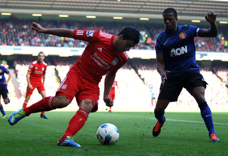 Liverpool's Luis Suarez competes with Manchester United's Patrice Evra during the Barclays Premier League match at Anfield on October 15, 2011 in Liverpool, England. (FILE)