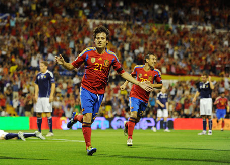 Two first half goals from Manchester City’s David Silva and a David Villa strike were enough for Spain who top the group with a 100 percent record from eight matches.