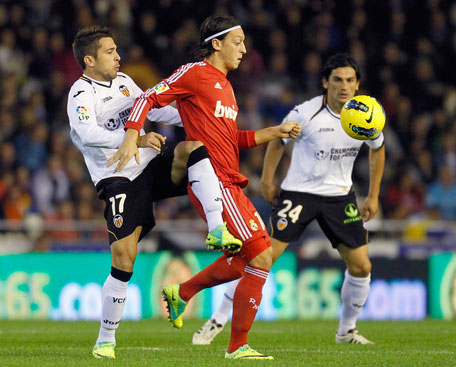 Valencia's Jordi Alba (left) fights for the ball with Real Madrid's Mesut Ozil (centre) during a Spanish first division match at the Mestalla Stadium in Valencia. (FILE)