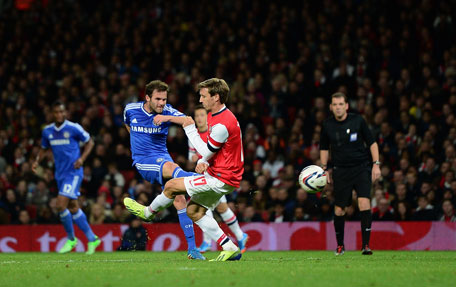 Juan Mata of Chelsea shoots to score his side's second goal during the Capital One Cup Fourth Round match against Arsenal at the Emirates Stadium on October 29, 2013 in London, England. (GETTY)