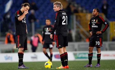 AC Milan's Zlatan Ibrahimovic (left), Maxi Lopez (centre) and Robinho react after Lazio's Rocchi (not pictured) scored during their Italian Serie A match at the Olympic stadium in Rome on Wednesday. (REUTERS)