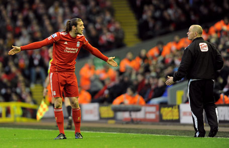 Liverpool's Andy Carroll protests to the fourth official during the Barclays Premier League match against Stoke City at Anfield on Saturday in Liverpool, England. (GETTY)