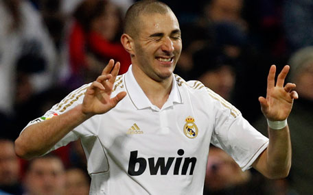 Real Madrid's Karim Benzema winks as he celebrates after scoring against Malaga during their Spanish King's Cup match at Santiago Bernabeu stadium in Madrid, on Tuesday. (REUTERS)