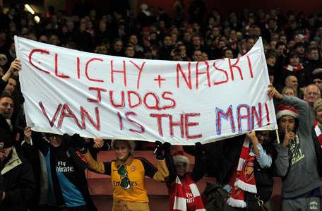 Arsenal fans hold up a banner berating former players Clichy and Nasri prior to the Carling Cup quarter-final against Manchester City at Emirates Stadium on Tuesday in London, England. (GETTY)