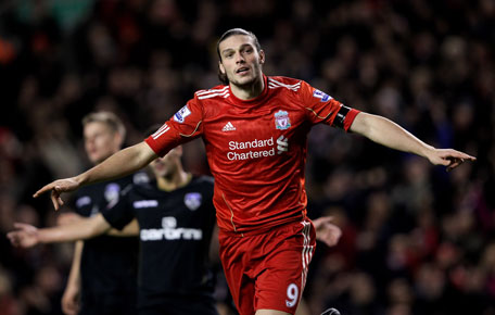 Liverpool's Andy Carroll celebrates scoring his team's fourth goal during the FA Cup third round match against Oldham Athletic at Anfield on January 6 in Liverpool, England. (GETTY)