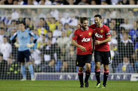 Manchester United's Michael Owen (left) celebrates scoring his second goal against Leeds with teammate Ryan Giggs during their English League Cup third round match at Elland Road Stadium in Leeds, England, on Tuesday. (AP)