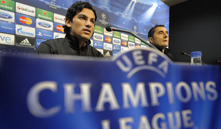 Valencia's Argentinian midfielder Tino Costa (L) and Valencia's coach Ernesto Valverde give a press conference at Mestalla Stadium in Valencia on February 11, 2013 on the eve of their UEFA Champions League football match against PSG. (AFP)
