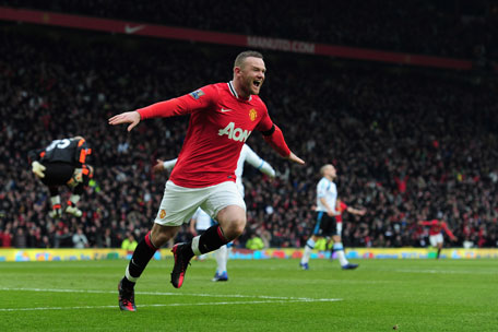 Manchester United's Wayne Rooney celebrates scoring his second goal during the Barclays Premier League match against Liverpool at Old Trafford on Saturday in Manchester, England. (GETTY)