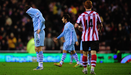 Man City's Edin Dzeko covers his head at the end of the Barclays Premier League match against Sunderland at Stadium of Light on Sunday in Sunderland, England. (GETTY)