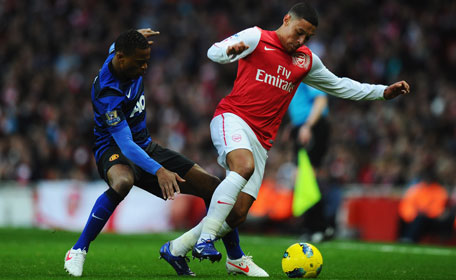 Arsenal's Alex Oxlade-Chamberlain evades Patrice Evra of Manchester United during the Barclays Premier League match at Emirates Stadium on Sunday in London, England. (GETTY)