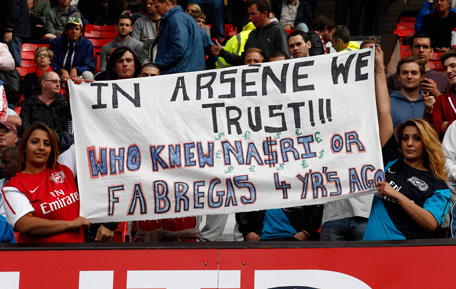 Arsenal fans hold up a sign in support of manager Arsene Wenger before their English Premier League match against Manchester United at Old Trafford in Manchester, England on Sunday. (AP)