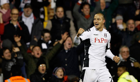 Fulham's Bobby Zamora celebrates after scoring against Arsenal during their English Premier League match at Craven Cottage in London on Monday. (REUTERS)
