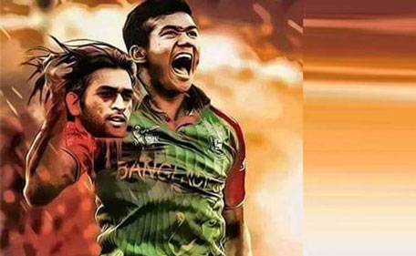 Image that has gone viral on social media...shows Bangladeshi fast-bowler Taskin Ahmed carrying the severed head of Indian limited-overs captain MS Dhoni (Pic: Twitter)