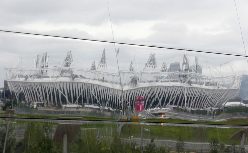 The Olympic Stadium is reflected in a temporary structure at the Olympic Park in Stratford, the location of the London 2012 Olympic Games, in east London on Wednesday July 18. (Reuters)